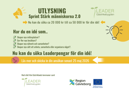 Vi tror att du vet bäst hur din plats kan utvecklas. Med stöd från Leader Gästrikebygden kan vi tillsammans utveckla vår landsbygd. Läs om hur du söker stöd från oss via länken.